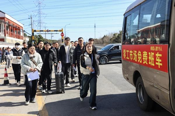 3月10日,上海,浦东新区零工市集上川路服务中心,劳务顶住招聘司理王巧巧(前)带求职者乘坐免费班车,准备赶赴企业口试。在这里,一上昼便收集了来自宇宙各地的400多位求职者。李茂君/摄