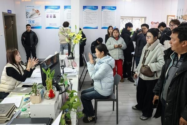 3月10日,上海,浦东新区零工市集上川路服务中心,在一家劳务公司的办公室内,口试及格者马上和用工企业缔结公约。李茂君/摄