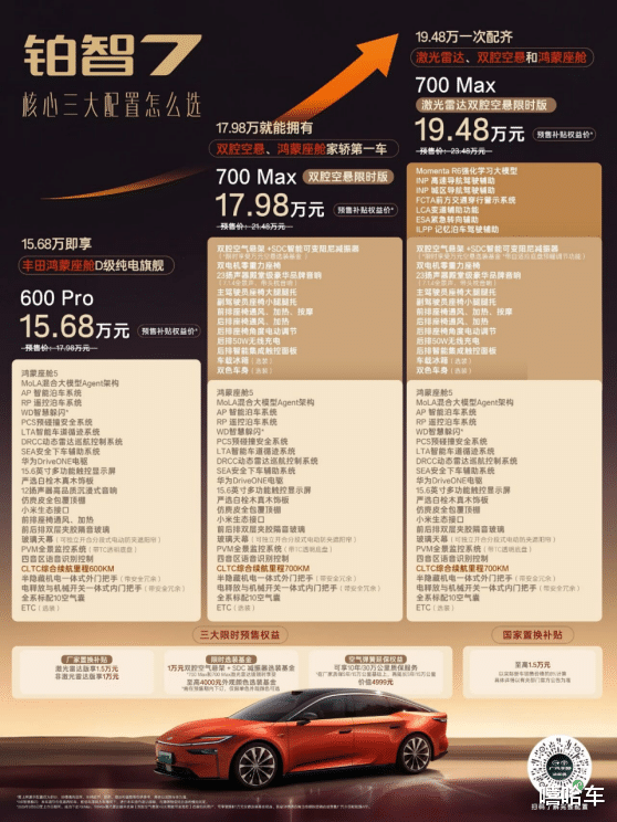 在此基础上,铂智7全系还可享最高1.5万元国度置换补贴。最终,铂智7预售权利价低至15.68万元起:
