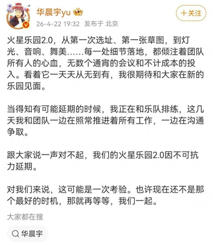 粉丝的诠释注解始终是,他也不知说念啊,王人是主办方的错。但说这话的东说念主,是不是把华晨宇念念得太无辜了?他是这个IP的中枢,是“火星乐土”的牌号,演唱会的每一站选址、每一处舞台假想,他不成能不外问。网上王人能查到的环保红线信息,他的团队查不到?